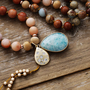 Introducing the Tranquil Earth Mala, a serene blend of Amazonite and Jasper stones, designed to promote balance, peace, and grounding energy. Amazonite enhances emotional healing, bringing calm and clarity, while Jasper offers stability, courage, and strength. This mala is accented with elegant gold detailing, adding a touch of luxury and harmony to your practice. Wear it to connect deeply with the Earth, encourage inner peace, and attract positive energy. Perfect for meditation, reflection, and everyday wear.