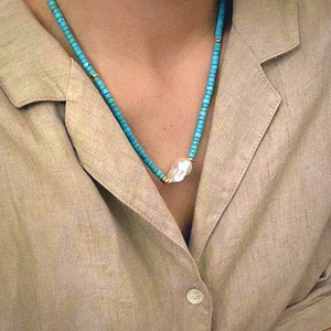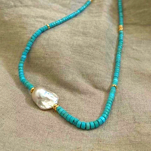 Turquoise is a protective and stabilizing stone that helps enhance communication and intuition. It is used to balance the chakras, aid in meditation, and bring inner calmness. Turquoise is a throat and heart chakra opener. Wear this gorgeous necklace to enhance your creative vision and intuition.