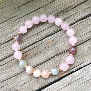 The You Are Loved Mala Bracelet is made with 8mm natural stone beads consisting of 100% natural Rose Quartz, Amethyst, Sunstone, and Labradorite.