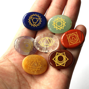 Improve your physical, spiritual, and emotional health by implementing this 7 Piece Engraved Chakra Stone Set into your healing practice. Bring attention to the body'sseven energy centers (chakras) and allow for balance to transpire; allow life's energy to flow and align with your spiritual energy body.