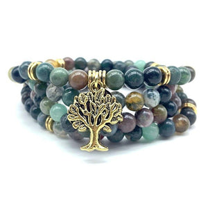 This Healing Indian Agate Tree of Life Mala features beautiful semi-precious Indian Agate stones as well as a tree of life charm. Each stone is different, making this piece unique and one of a kind just for you. Its wide variety of neutral colors represents the most grounding, precious, and natural entity of all; nature. Beautiful blue, green, red, pink, orange, yellow, and brown hues represent our sacred planet Earth. Let this unique mala necklace remind you of the gift of Mother Nature. Be at peace wearing this necklace as it resembles our mountains, forests, oceans, the sky, stars, the moon, and the sun. Indian Agate is a powerful healing stone and an excellent protection stone as well. It gives physical strength and emotional security. Indian Agate helps balance energies as well as promote courage, healing, and calmness.