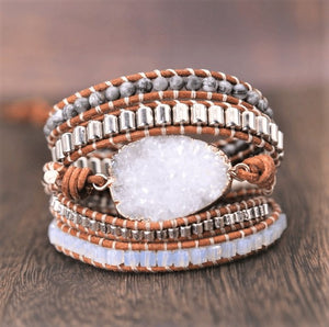 The Serene Celestine Wrap Bracelet features a large iridescent Celestine center stone. Like ice crystals, this gorgeous Celestine crystal casts magnificent blue, purple, pink, and yellow colors. The name "Celestine" means 'of the sky'. It is said that this stone was discovered by a popular star group called the Pleiades and it holds ancient celestial wisdom.