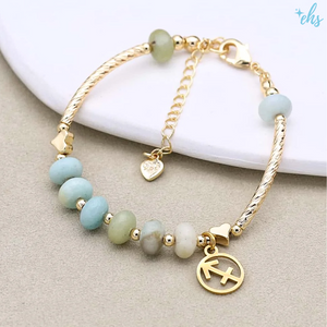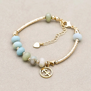 Embrace your inner balance with the Zodiac Amazonite Charm Bracelet—a stunning adjustable gold bracelet designed to align your energy and express your star sign. Featuring a beautifully detailed zodiac charm of your choice, this piece is more than just jewelry—it’s a personal statement. Known as the “stone of truth and harmony,” Amazonite is believed to soothe anxiety, enhance communication, and promote emotional healing. Its calming energy pairs perfectly with the celestial touch of your zodiac sign, creating a meaningful blend of style and spirit. Wear it solo or stack it with intention—either way, it's a radiant reminder of your unique cosmic energy.