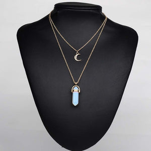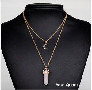 This Natural Healing Crystal Moon Choker is a statement piece! A silver or gold-plated double chain drapes beautifully around your neck. Select from seven different natural crystals to dangle from the longer chain. The short chain, a choker, contains a gorgeous crescent-shaped moon.