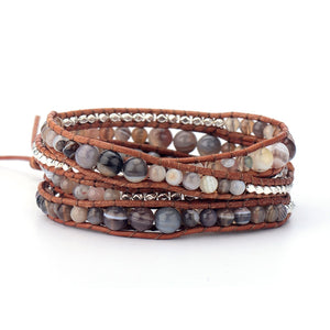 This Elegant Botswana Agate Wrap Bracelet provides comfort and protection. Botswana Agate stones are beautifully formed with layers of pink, brown, and gray hues providing softness and warmth to the wearer's soul. This beautiful stone brings about a quiet energy, particularly good for meditation, and allows for the balance of the mind, body, and spirit to return. As you return to your center, you will feel love and strength; you will be able to see solutions to problems rather than dwelling on roadblocks and difficulties.